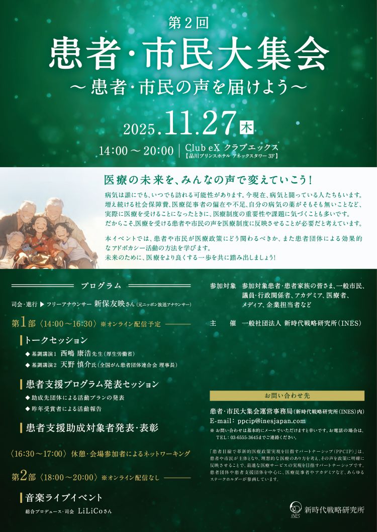 エイベックス・ヘルスケアエンパワー合同会社(本社:東京都港区、代表 保屋松 靖人、以下:AHE)は、 一般社団法人 新時代戦略研究所(所在地:東京都千代田区、代表 朝井 淳太、以下:INES)が主催する イベント「第2回 患者・市民大集会 ~患者・市民の声を届けよう~」の企画・制作に協力いたします。 本イベントは、患者中心の医療実現を目指すパートナーシップ「PPCIP(Partnership for Patient-Centered Innovative Policy)」の一環として開催されます。
